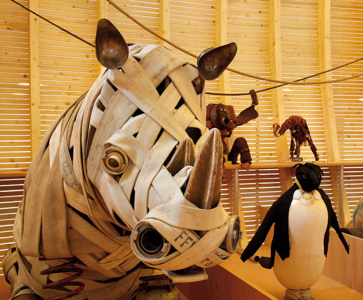 ANOHA居住著150多隻雕塑動物,每隻動物都由18位柏林藝術家團隊根據發現的物品製作而成,這種方法鼓勵孩子們考慮回收和適應性再利用的重要性,同時支持ANOHA的創造力和想像力的核心理念,這些雕塑物品的觸覺性質和孩子們在認識用來製作它們的熟悉材料時擁有有趣及發現感,進一步強調了尊重、珍惜和保護全球資源的重要性,沿著直觀的訪客通道放置的互動展品教會孩子們如何獨立和與群體之間的相處,而以獨特棲息地為模型的探索空間,讓孩子們體驗各種動物的不同視角。