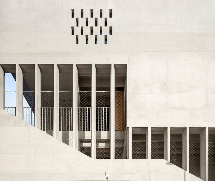 乍看之下,這塊巨石結合了塊狀物和礦物質,紀念性是它在這個密集區存在的條件,該地區設計建造高17層的公寓計劃,建築師主動限制了建築和技術組件的數量,以確保材料的簡單性與使用壽命,也確保易於維護,建築採用「低碳」的淺色混凝土,介於Pouillon的摯愛的珍珠白和米色之間,建築澆製一步到位,沒有接縫。艱苦的「皮膚」工作產生了交替的椰殼沙和光滑的部分,啞光和亮光的表面,以及光與影的相互作用。