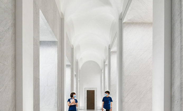 通往Via del Corso的外牆也經過精心修復,其大窗戶可以看到商店和美麗的室內庭院,商店的入口是一條歷史悠久的通道,通向庭院兩側是兩個寬敞而引人注目的空間,慶祝歷史悠久的宮殿宏偉樣貌,中央通道的拱門和拱頂內襯Carrara石材,精心挑選以匹配現有的大理石,營造出引人入勝的景觀引向大樓梯,這些空間是所有客戶參與、探索Apple最新產品及其周圍藝術品的理想場所。