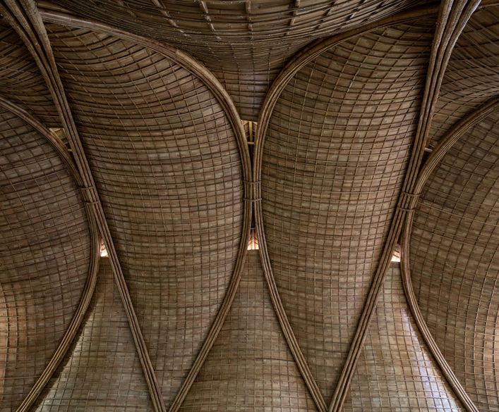 有史以來第一座此類建築,綠色學校的弧形建築由一系列交叉14公尺高的竹拱構成,跨度為19公尺,由抗碎屑網格殼相互連接,這些拱形從兩個相反方向的彎曲中獲得了力量,Arc是一項工程壯舉它需要數月的研究和開發以及對訂製細節的微調,其結果是具有無與倫比的美感和精緻的設計,這證明了IBUKU致力於擴大建築和設計領域的承諾。