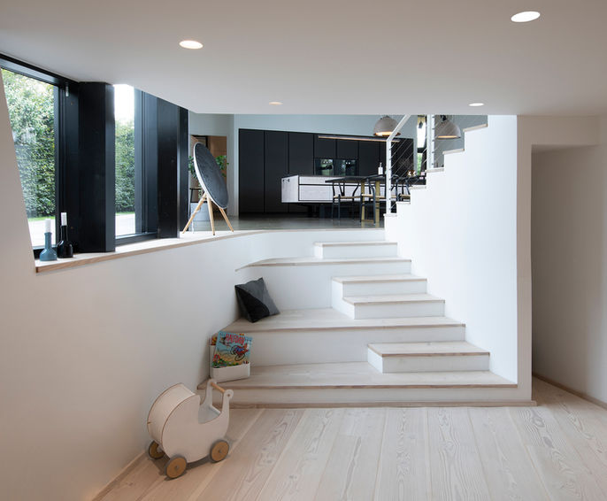 房屋本身在花園的兩端設計成兩個沉重的磚砌實體,上面裝有輕巧的、漂浮在白蠟木中的有機屋頂,從而形成了一個中央、開放、透明的公共起居空間與房屋的各個部分相連,業主負責大部分的建設,這種自我構建實現了更大的自由度,更高的工藝水平以及設計過程的整體實驗方法,在特殊條件下,考慮到大量的量身訂製的細節,這些材料的加工賦予了房屋真正的獨特性。