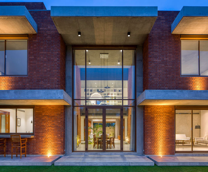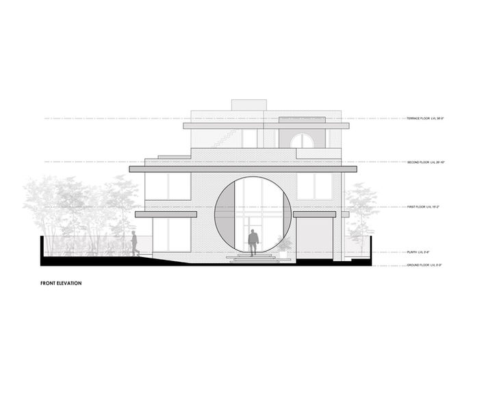 與規劃概念同步外部是一個簡單的幾何體,包括一個帶有裸露混凝土懸垂和大開口的大膽磚塊,為了打破這種既定的形狀,在立面上引入了一個有趣的圓形輪廓,然後在房子裡進一步探索這個元素,打破單調的形式,房子被概念化為最小的,比單個元素更重視空間,三種材料磚、混凝土和木材總結了材料調色板,與灰色地板形成鮮明對比的磚塊在房屋中營造出微妙紋理的並置,這些天然材料所創造的體驗與來自世界各地的客戶積累的一些家具和藝術品,並且變量一起完成。