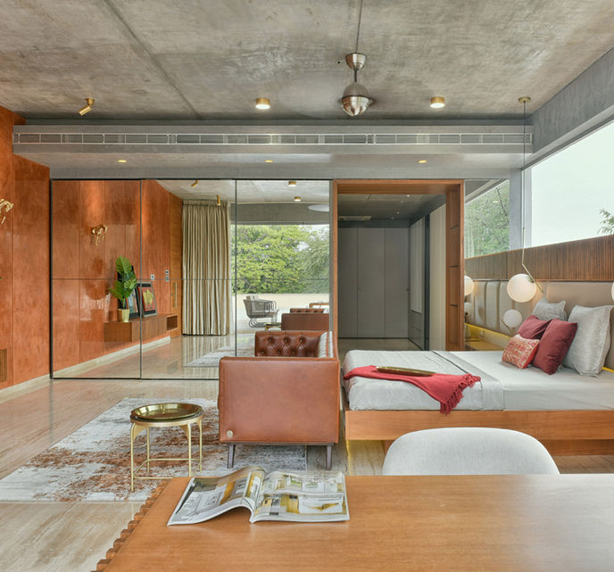 這房子由兩扇翅膀組成由雙倍高度的空間相連,入口門通向東翼,這邊有一間客廳,旁有一個裝有芒果樹的水上庭院,該庭院的走廊通向一個鵝卵石區域,與此相反的是帶有鞦韆的木製甲板,另一個西翼有兩間臥室、一間書房,可通過長長的走廊進入這些走廊,而走廊變成了座架上有繪畫和雕塑的畫廊,東方的陽光透過穿孔的磚砌立面在這堵牆上投射出各種陰影,整面牆都接受了黃色的灰泥石灰石膏,並在網格上安裝了黃銅旋鈕。