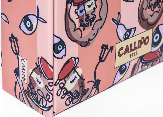 Callipo的聖誕包裝系列中,Antonioaricò操刀設計了五個禮品包裝盒,其中三個為木製包裝,另外兩個則是紙盒式的包裝,並且每個禮品和的靈感都是來自於不同的神話與故事;例如Oissa的包裝盒是釣魚的現場,以當時捕捉金槍魚時的辛勞與努力做為此包裝的視覺效果,或是Tonnarot i禮盒為致敬農民捨棄農具到外海幫助捕撈金槍魚的故事。