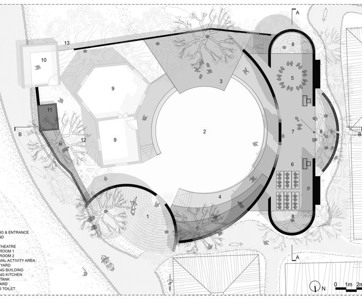 通過添加一堵平行於曲線的牆來創造一個有蓋空間,它可以容納兩個教室,在這種形式中創建了一個非正式的活動區,它分隔和連接了兩個教室,也有助於一位老師建立對學生的教學,並幫助他們像以前一樣合作學習,在教室裡增加半圓形庭院是為了將學生種植的現有樹木圍起來。