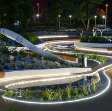 遊樂場地與水池交織,充當足浴池。鋪地指向噴泉,成為繽紛的水上玩具的背景。在水上操場周圍有供父母用的長椅和座位,有助於他們觀看孩子。