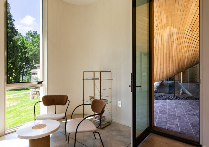 屋頂和雕塑天花板由Pure Timber LLC提供的彎曲白橡木製成,而設計團隊對層疊地板使用了相同的材料,壓縮彎曲的木材首先經過蒸煮使其柔韌,然後將其放置在壓縮室中,此過程將板縮小至原始長度的25%,同時保持其他尺寸,木材經過進一步壓縮和靜止以平衡木板中的力,然後將其運送到含水量相對較高的現場,使其在安裝和完全乾燥之前具有彈性。