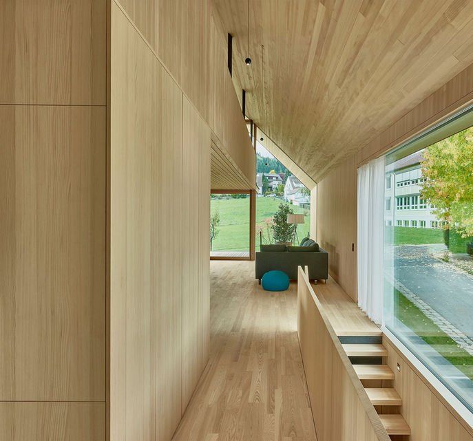 建築除了與地面接觸的部分外,房屋均建為木結構,傾斜的地板由裸露的混凝土製成,北側的凹槽標誌著房屋和屋頂車庫的入口,從寬敞明亮的入口區經由扇形的階梯一直通往上層,由大客廳窗戶照亮,私人房間在山谷的一面朝東北,而起居室的玻璃正面朝西南,懸掛在屋頂上的畫廊為學習提供了空間,並部分的創造了山牆高的居住區,由於畫廊中已經安裝了小浴室,因此以後可以通過插入隔斷牆將客房或兒童房分開。