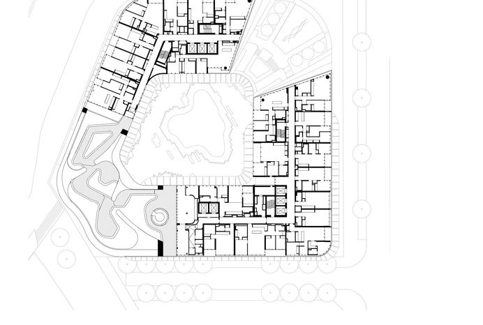 為公共利益而採用輕巧的形狀Infinity以特殊的方式建造,經過雕刻和傾斜的形式使地下建築的公共廣場和綠色廣場圖書館有了更多的陽光,南側的梯田公寓結構設計為帶有外部露台花園的層疊公寓,規劃上希望提供更好的太陽吸收,這樣的梯田式公寓設計讓空間方便換氣、收集雨水吸引更廣泛的社會經濟群體公寓組合以及用於社交互動的公共花園。