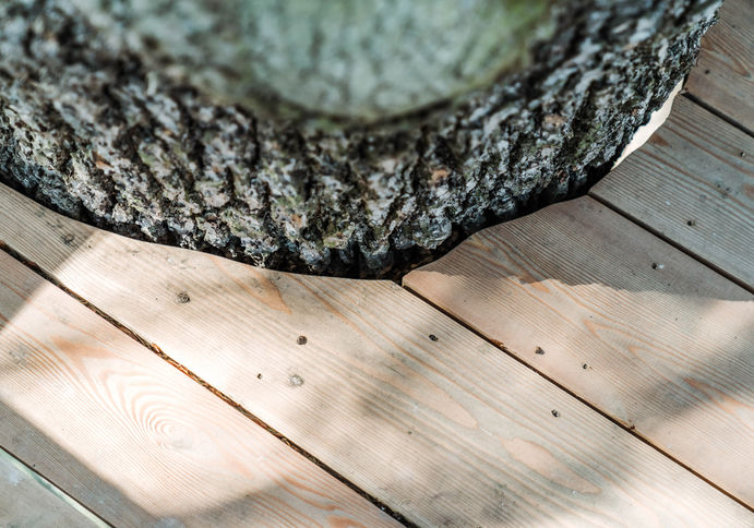選擇了焦白的落葉松木皮做外部的包覆,以保持其陰影般的質量,從而使樹屋在觀感上就像縮在樹裡,老式的屋頂板是由栗木製成,因為這些是裂縫不是鋸切的,所以特別有大自然的粗糙與手感。