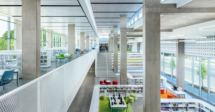 一二層樓的圖書館適合全年齡層的人一同閱讀與學習的區域,並且付有一個大型的社區多功能教室,教室可以用於演講、聚會與活動。圖書館二樓衍伸出來的空間設計為停車場,上方則形成了露臺式的公共公園,可作為社會住宅的戶外休憩空間及圖書館的戶外閱讀區域。