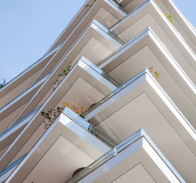 玻璃襯砌的陽台在某些區域凹陷,而在另一些區域則向外突出,使它們從遠處看起來傾斜,沿著建築物的一個角落,露台朝不同的方向移動,該團隊表示:「樓層的旋轉增強了住戶對公園的開闊視野,顯然與綠色環境建立了聯繫。」