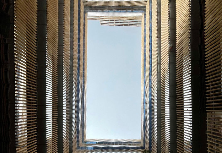 展館的外部圍護結構由4000平方公尺、33公尺高的夯土立面組成,這是一項夯土技術上的壯舉,開創了夯土施工方法的進步,夯土是Morocco傳統建築材料,在炎熱乾旱地區被動調節室內條件方面發揮著關鍵作用,它在展館中的使用的夯土材既是傳統又是創新的材料,說明傳統的Morocco建築方法如何能夠激發更永續價值的城市發展,與建築設計中使用的其他被動策略相結合,例如兼作防曬的木質內壁板,夯土立面使展館能夠完全滿足LEED指標標準。
