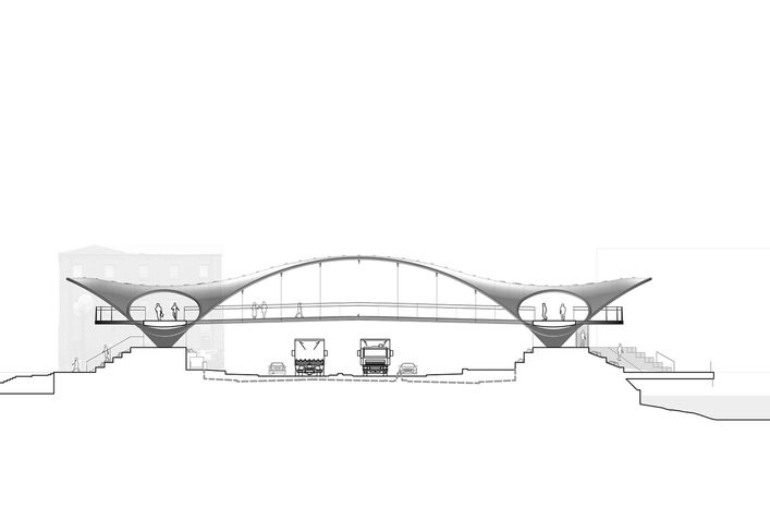 橋梁誇距長達40公尺,以鋼構與混凝土構造橋面懸掛在優雅的鋼拱/殼混合結構上,該結構還充當天篷,在每一端打開以創建遮蔽的景觀點,雖然兩側可用土地有限,但通往橋樑的通道被設計成不同特色的景觀公共空間,為人們提供享受旅程和欣賞城市和碼頭美景的地方。