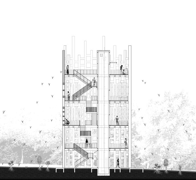 柱樑系統的規劃以80x80 與35x90 cm的錯綜形單元構成。塔樓的中心是鋼製樓梯,從空中看去一覽無遺、同時也減弱了陽光直射所產生的熱能。