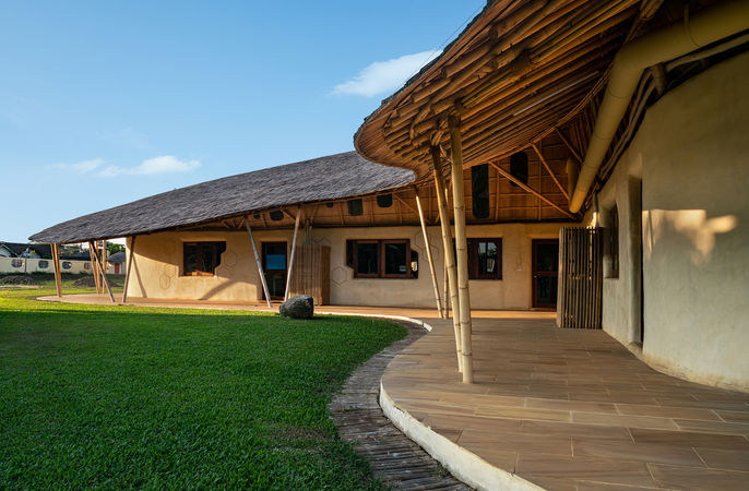 建築材料的選用皆使用天然才,除了竹構外,土坯牆也是一項很好的隔音材料,可以確保每個教室空間都有良好的隔音性,保持教學時的安靜,屋頂的設計以兩個類似翅膀的構造組合在一起,保護下方的結構與室內空間,在室內也可以看到竹構造所形成的彎曲曲線,這樣不僅激勵著學生的好學心情也能與自然的聲音保持聯繫。