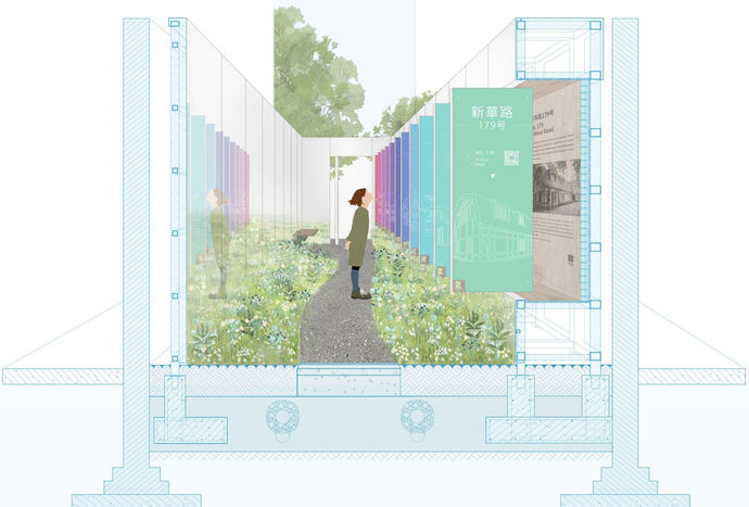 入口處則使用耐候鋼構成,設置了一個關於新華路歷史建築的永久性展覽空間,設計團隊認為整個新華路應該被看成一個現代的博物館,而這裡將成為介紹新華路上珍貴歷史建築的場域,所以使用具有厚重感的耐候鋼是對歷史的回應,同時保有謙卑且自然的佇立在城市街道上。