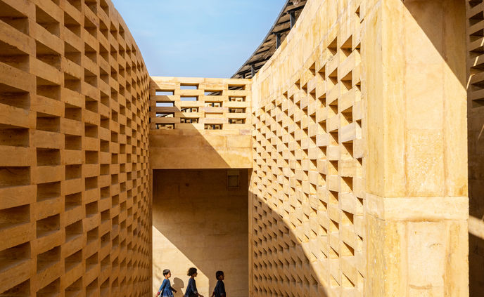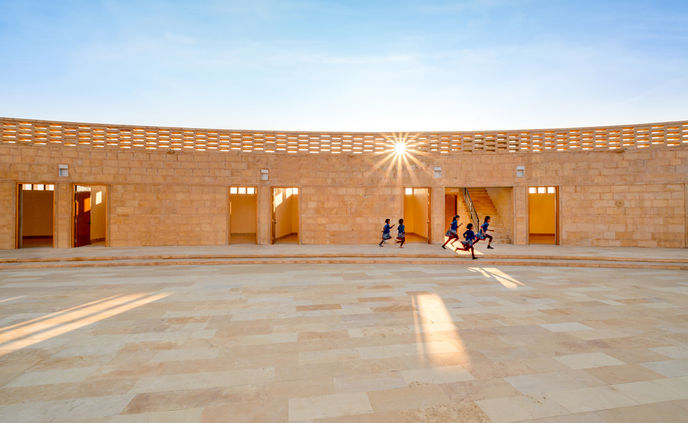 Rajkumari Ratnavati女子學校完全由當地工匠手工雕刻的Jaisalmer砂岩製成,對於Kellogg而言,將社區納入為社區打造的建築物中至關重要,使用當地材料創建基礎設施有助於減少碳排放,Kellogg選擇在屋頂上建造太陽能光電板頂蓋作為冷卻系統,該系統的溫度峰值接近120度,頂篷和jalis都可以將熱量散發出去,而且結構的橢圓形形狀還有助於帶來可持續性,從而創造出散熱的面板。
