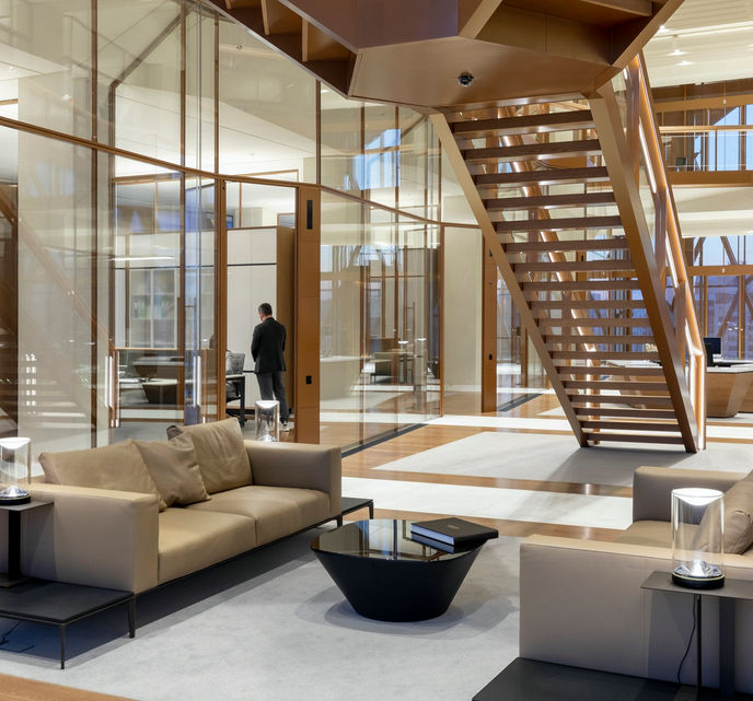 辦公樓層的起點將總部重塑為「員工之家」,而不是傳統的大型公共工作空間,而是更貼近家庭的房間,執業部門的工作場所諮詢小組分析了客戶的運作,並為這些房間設計了創新的模塊化系統,然後與內部工程團隊一起開發了此工具,以實現快速施工並確保集中工作的理想自然採光水平。