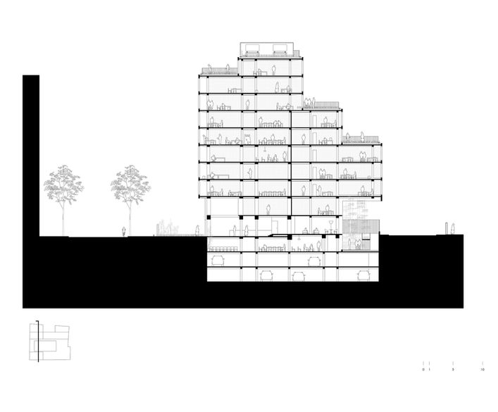 該案例已被雕刻以創造一個獨特的身份,現有的結構和擴展融合在一起,創造了一個新的量體滿足監管限制,並允許光線垂直和水平的進入建築物,這種量體的相互作用創造了大量種植的露台,成為工作空間的真正延伸,內部空間也經過重新設計,創造出標誌性的雙層和三層高空間。