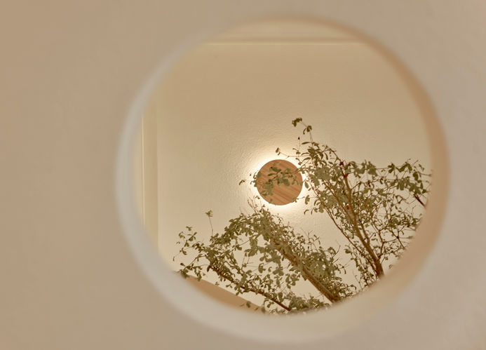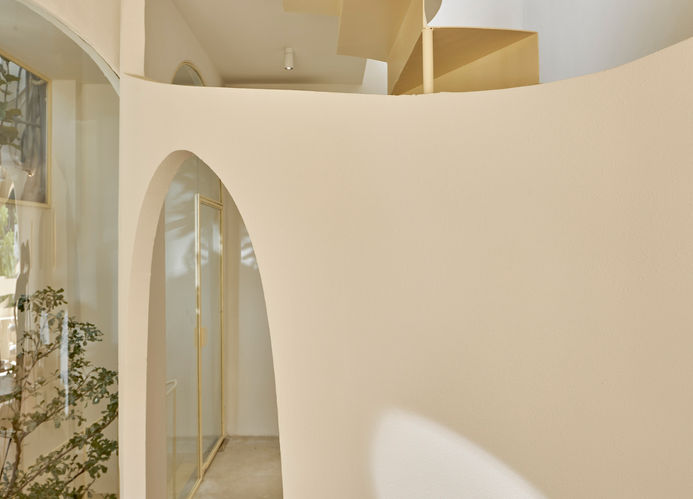 此外,通過入口、樓梯、牆壁上的玻璃孔,甚至到家具上的微小細節,圓形圖像和曲線提醒,風的圖像由空間中的曲線引導,穿過天花板、牆壁和地板,營造出一種輕盈的感覺,就像微風蔓延到每個角落。