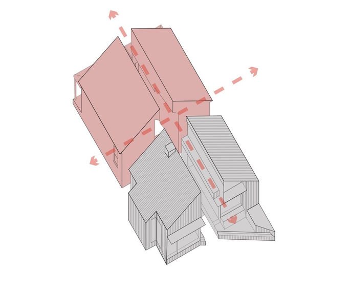 Split House新增功能沿現有屋頂輪廓線切割,下方降低的屋頂沿線加強了開放式起居空間中現有的雙載重走廊的線條,從而將空間分成兩個區域,東向的廚房和餐廳;西向的休息室,傾斜的屋頂線在兩個空間內部展現出來,降低的走廊天花板則將空間分隔開來。