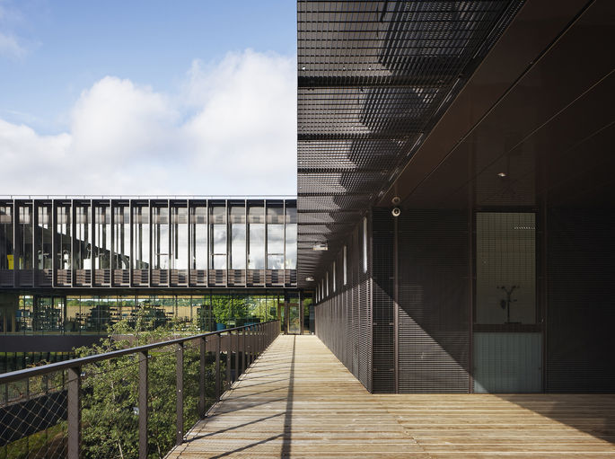 一層建在斜坡上,因此學院的學生、行政人員在這層貫穿建築的走廊上相連接,這些空間透過大露台相連,成為內部與戶外空間之中建立了選擇性的對話,在二樓的教室可欣賞公園和中央花園等獨特景色。